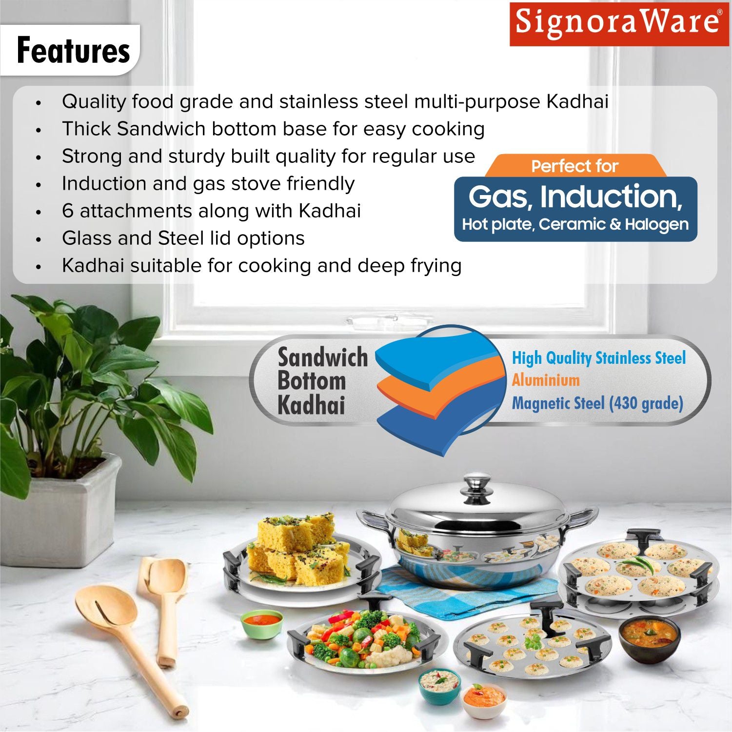 Features Detail: This Signoraware kadhai offers even heat distribution for consistent cooking. Its sandwich bottom prevents burning and sticking. Compatible with both gas and induction stoves, it suits all kitchens. The wide base and sturdy handles give a comfortable grip and better control while cooking. Stylish, strong, and built for regular use.