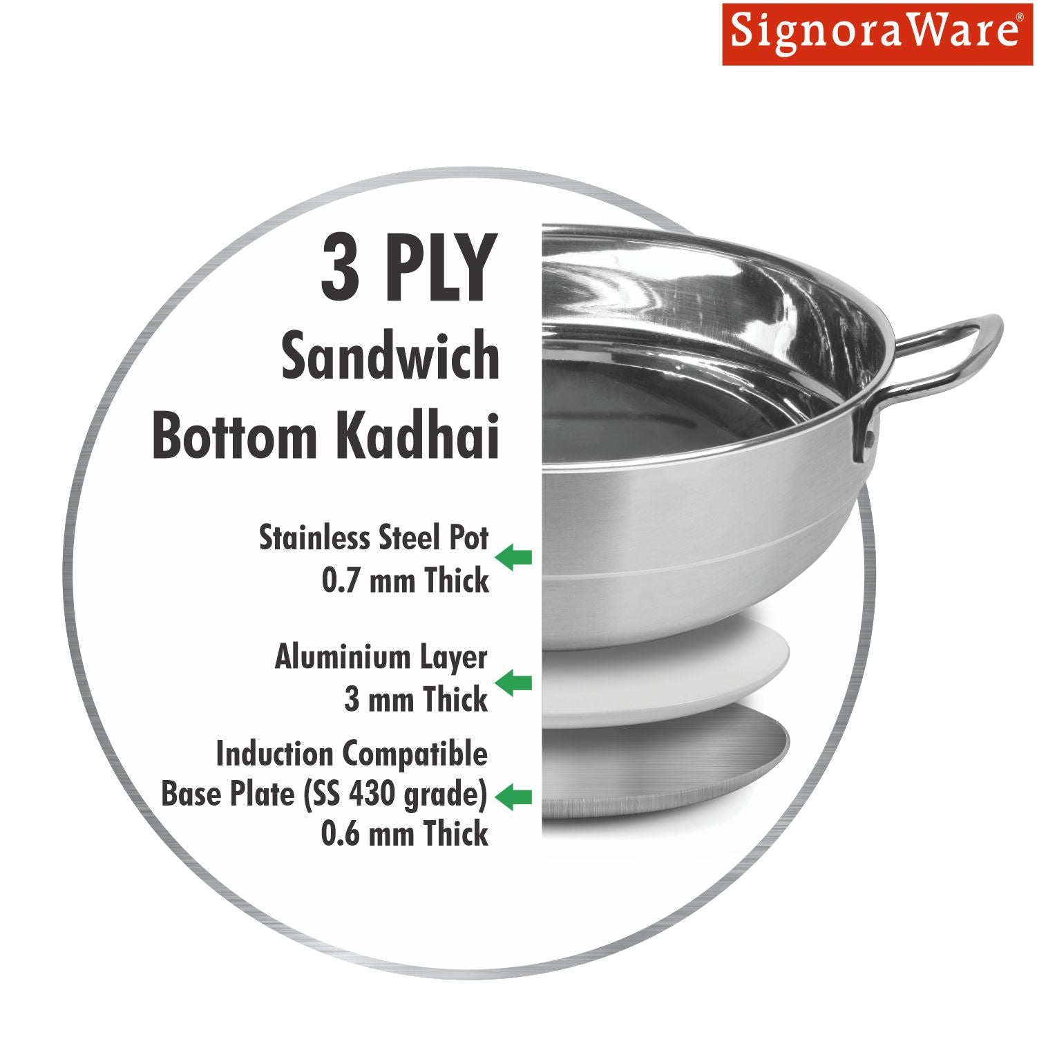 Material Description: Dimensions: 37cmx28cmx16.5cm | Capacity: 5Ltr | This Signoraware kadhai is made from Tri Ply stainless steel, offering three durable layers for even cooking. The inner layer is food-safe stainless steel, the middle is aluminium for quick heating, and the base is induction-friendly steel. The sandwich bottom ensures strength, long life, and energy-efficient performance in every use.