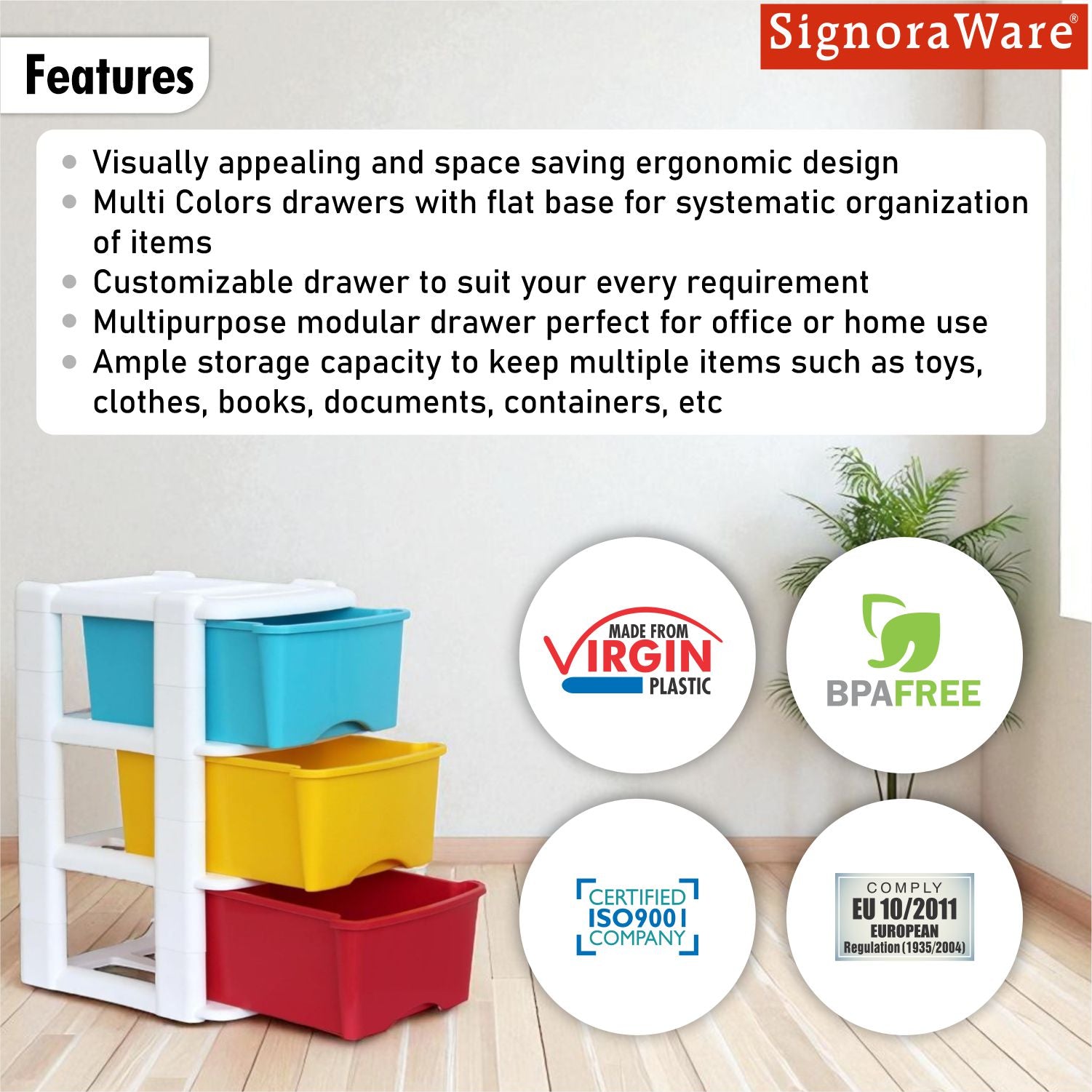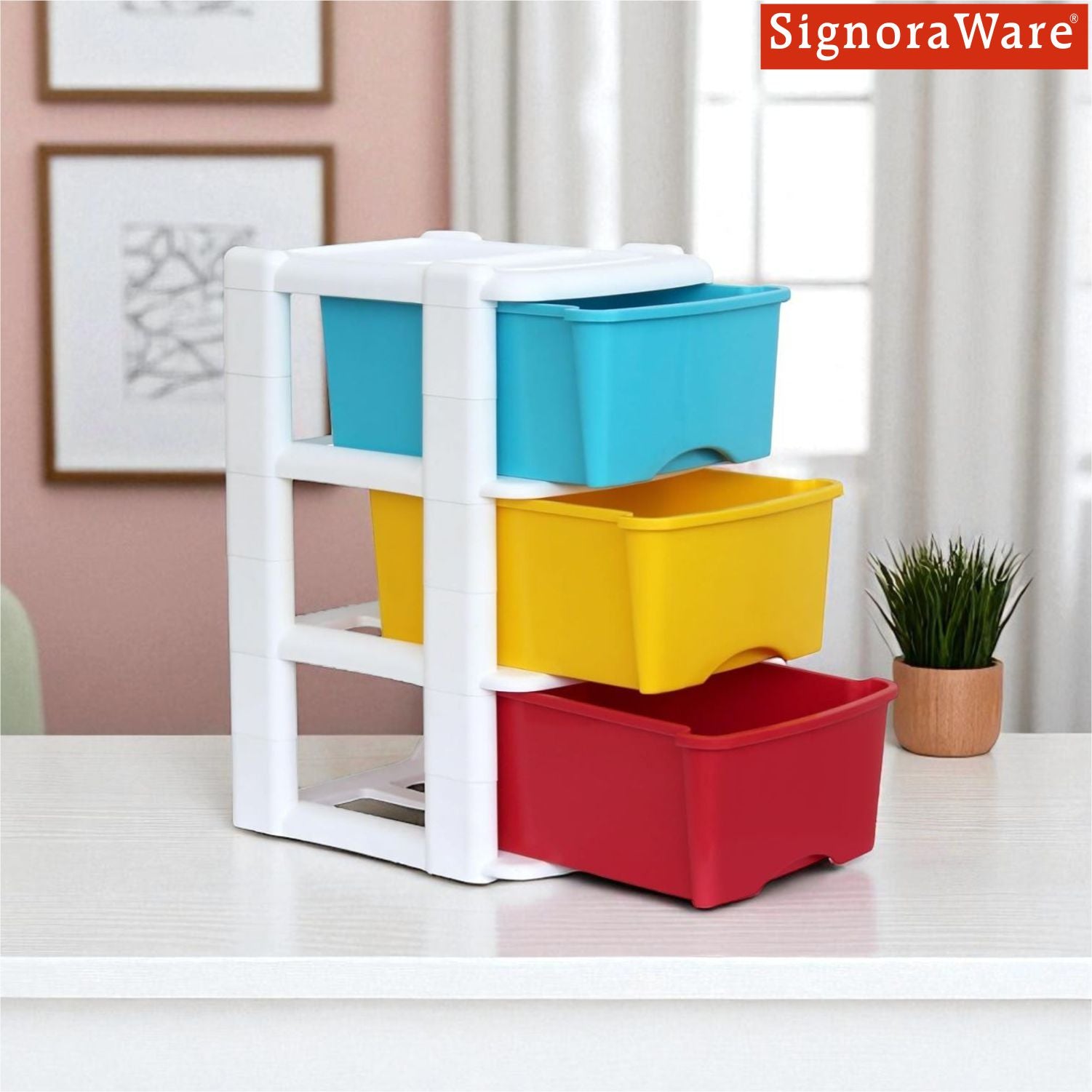 SignoraWare Modular BPA Free Plastic Big Organiser 3 Tier | Modular & Stackable Design | Smooth Pull Drawers | Compact & Space-Saving | Home, Office, Craft & Garage Use ( 12.8Ltr x3 | Multicolour )